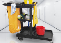 The janitor's cart is the ultimate mobile system for collecting waste, transporting cleaning tools while keeping everything organized with convenient shelving and hooks. The carts provides enough space to store janitorial supplies with features like multiple hooks to hold brooms/ handbags, dustpans and floor signs.