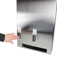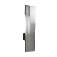 Dispensador de productos femeninos con botón pulsador gratuito para compresas y tampones - Capacidad para 15 compresas nº 4, 11 compresas nº 6 y 22 tampones / Gris / Acabado cepillado en acero inoxidable.