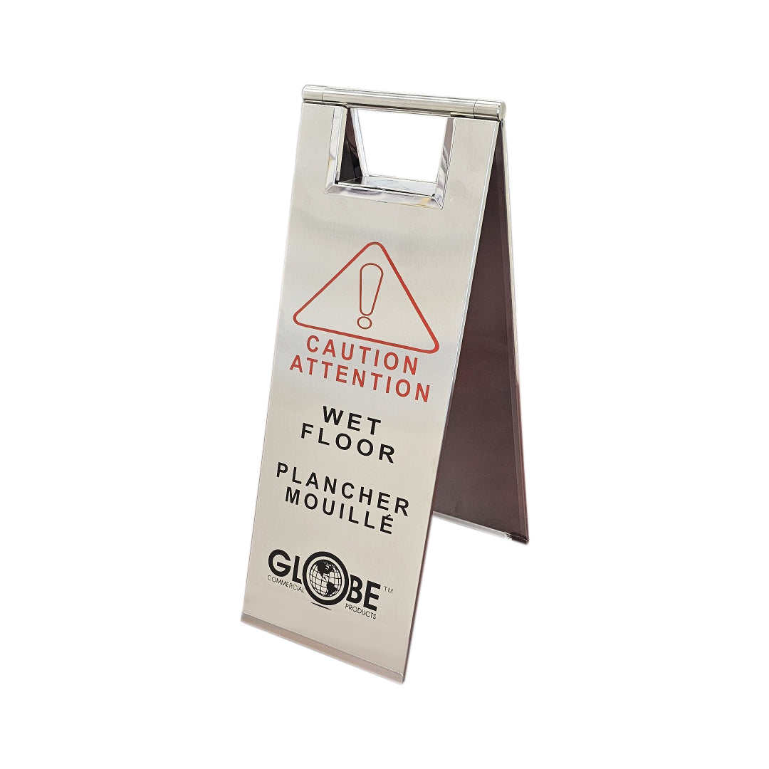 Improve safety and aesthetics with the Stainless Steel Wet Floor sign. Let patrons know of possible slip and fall areas due to mopping, leaks, spills or snow and ice. Reduce your liability and help keep your facility safe. Bilingual to reach a wider audience.